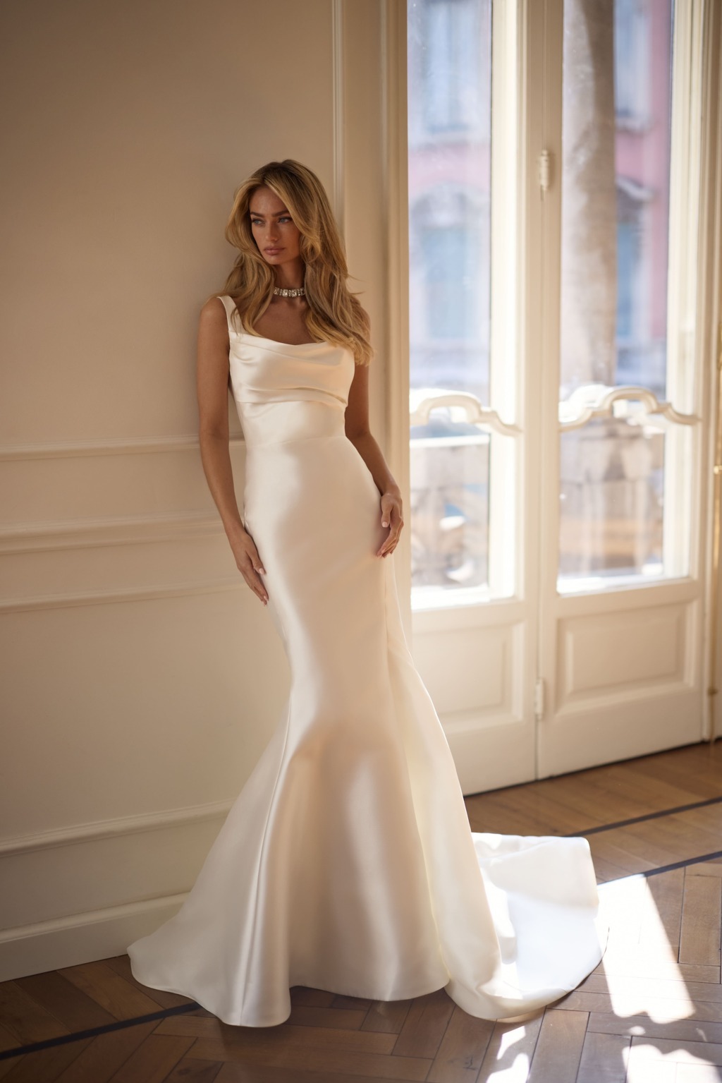 Abiti scivolati e i modelli a sirena, impreziositi da applicazioni gioiello lungo tutta la superficie.